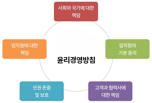 우리는 제반 법규를 준수하고 높은 윤리적 가치관을 바탕으로, 투명하고 공정하게 업무를 수행하며, 성실과 최선으로 주어진 책임을 다한다.