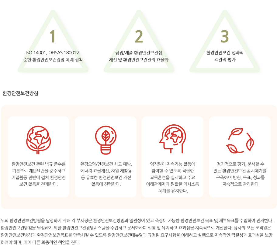 | 근로환경 | · 안전보건경영, 산업안전보건 법규 준수 · 작업 안전관리 및 무재해 실천 | |